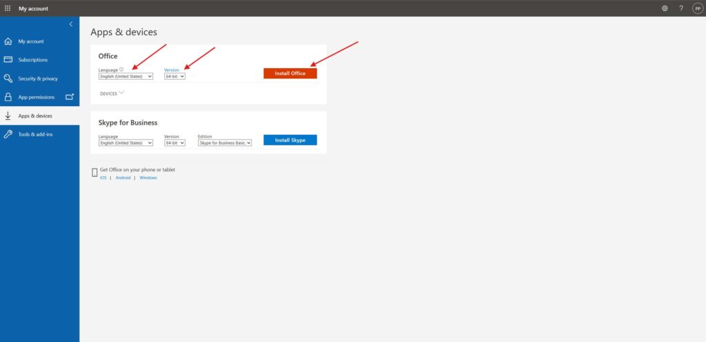 Choose your preferred language and version (64-bit recommended) and click install office.